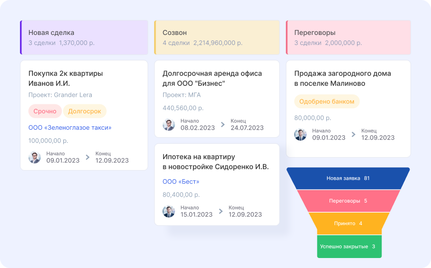- Сделки перестанут теряться. Частный риелтор Андрей разместил объявление о своих услугах на 5 площадках. Иногда он пропускал звонки или сообщения, поэтому часть лидов терялась. Когда Андрей начал использовать CRM, автоматическая воронка продаж собрала все лиды с разных площадок и создала сделки. Теперь агент не пропускает заявки и работает с клиентами в режиме одного окна.