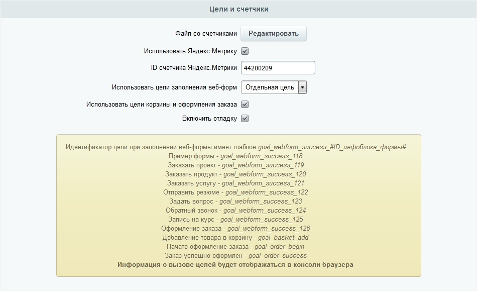 Список идентификаторов для Яндекс.Метрики вместе с примечаниями-подсказками выводится в админке сайта. Все, что вам нужно – скопировать идентификатор нужной цели в настройки системы аналитики. А если вы создадите новую веб-форму, подсказка с идентификатором для нее будет выведена автоматически.