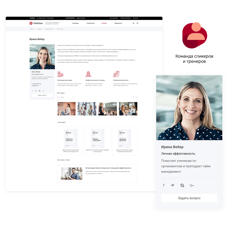 Покажите, что в вашей компании работают лучшие педагоги. Расскажите подробнее об их преподавательской деятельности, подходах к обучению и заслугах. Опишите их труды: научные работы, методички, учебники. Прикрепите дипломы об образовании и пройденных курсов повышения квалификации. Не забудьте добавить курсы, которые они преподают или мероприятия, где они выступают спикерами. Это поможет повысить лояльность и заслужить доверие.