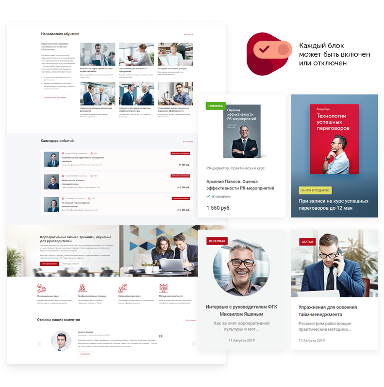 Для адаптации шаблона под специфический бизнес разработчики продумали каждую мелочь: от структуры проекта до заголовков и баннеров. Задача максимум выполнена — вы можете запустить работающий сайт за неделю, чтобы привлекать новых студентов, слушателей и спикеров.