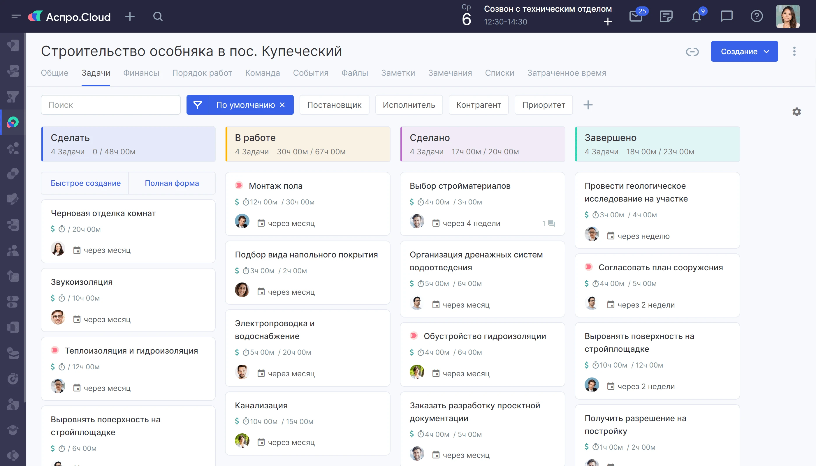 В области строительства постановка задач включает в себя выстраивание точных стратегий, контроль расписаний, оценку качества работы. При этом в строительстве управлять проектами могут сразу несколько человек. В Аспро.Cloud функция управления проектами даст возможность не только спланировать проект, но скоординирует выполнение задач, распределит ресурсы и отследит затраченное время.