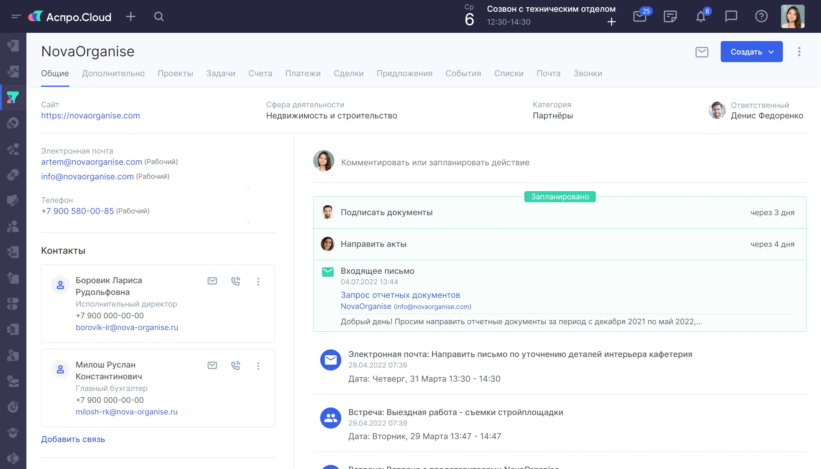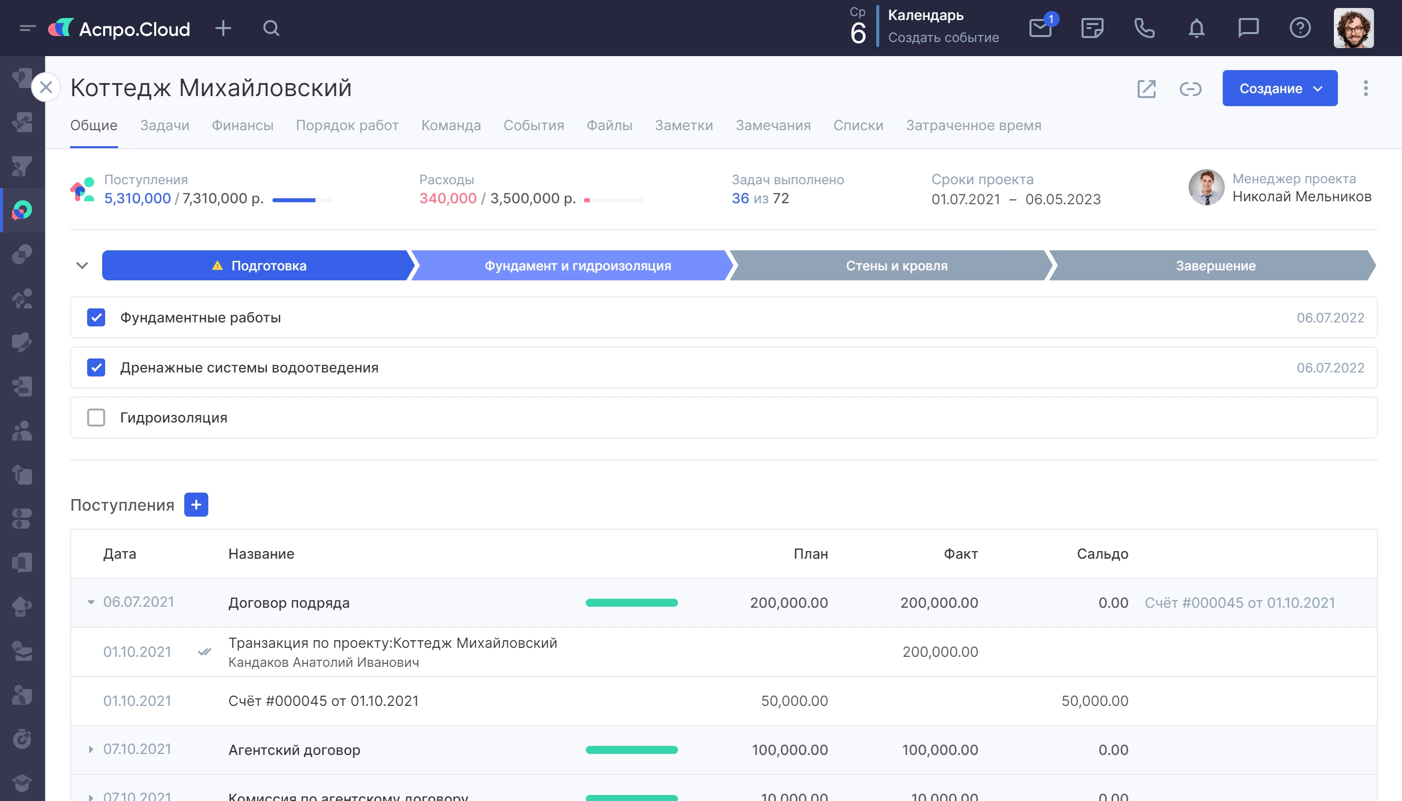 Строительные организации имеют запрос на автоматизацию работы подрядчика и управление строительными объектами. Например, CRM-система Аспро.Cloud предлагает: