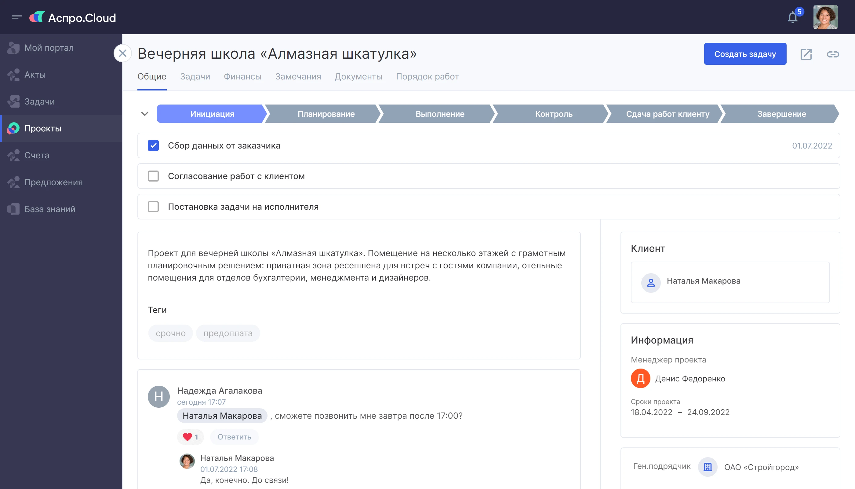 Подробнее о том, как управлять проектами в Аспро.Cloud читайте по ссылке.