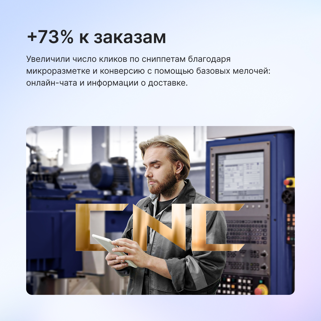 Сэкономьте 90 000 ₽ при покупке SEO-продвижения для интернет-магазинов и 48 000 ₽ — для корпоративных сайтов. Оставьте заявку до 31 августа и забронируйте себе скидку! Проведем анализ проекта, выполним техническую настройку, нарастим ссылочную массу, оптимизируем CTR страниц и подготовим ТЗ для написания оптимизированных текстов.