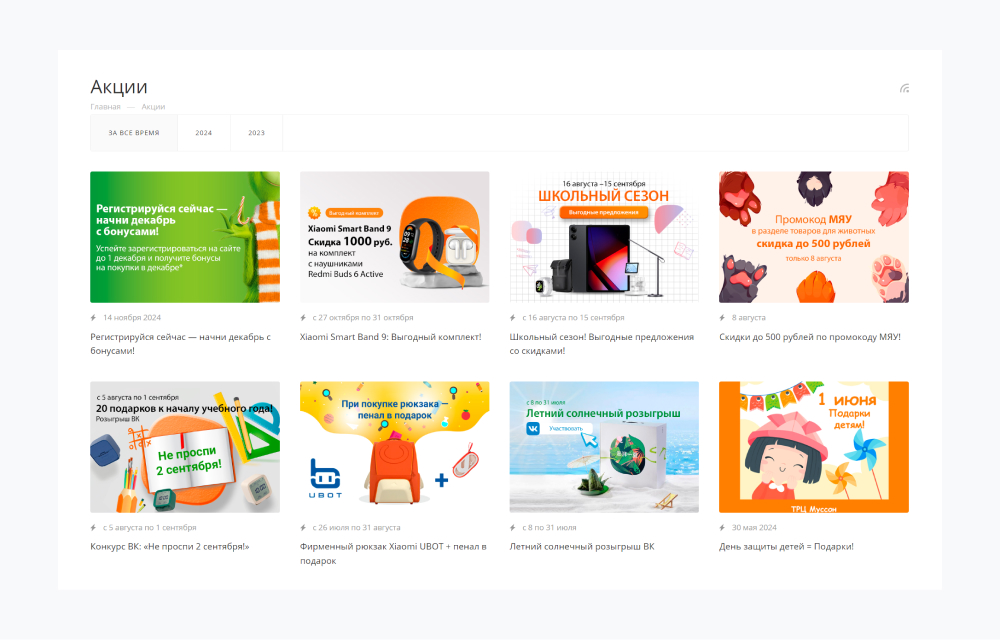 Устраивайте разные спецпредложения для привлечения новых клиентов, например, предлагайте бесплатную доставку при оформлении заказа на определенную сумму. Разместите на главной странице баннеры с актуальными акциями и распродажами. В каталоге к акционным товарам добавьте стикеры «Акция» или «Скидка». Также создайте раздел на сайте со всеми спецпредложениями.