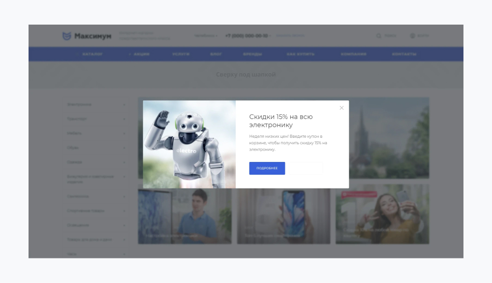 Добавьте маркетинговые окна, боковые и сквозные баннеры, чтобы привлечь внимание аудитории к спецпредложениям. Например, напишите, что для новых клиентов предлагаете бесплатную доставку. Также можно сделать яркую кнопку «Акции» в шапке сайта.