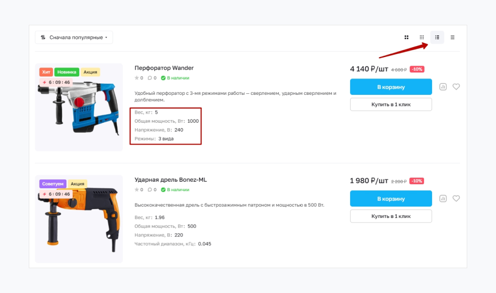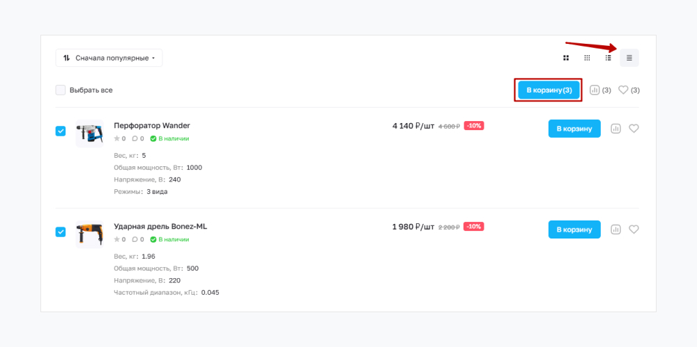 Тип отображения товаров в каталоге также сказывается на скорости поиска. Например, если покупатель выбирает инструмент для ремонта по характеристикам, тогда лучше вывести карточки с описанием и свойствами. А для оптовых покупателей лучше сделать отображение списком с возможностью массового добавления в корзину отмеченных электроинструментов.