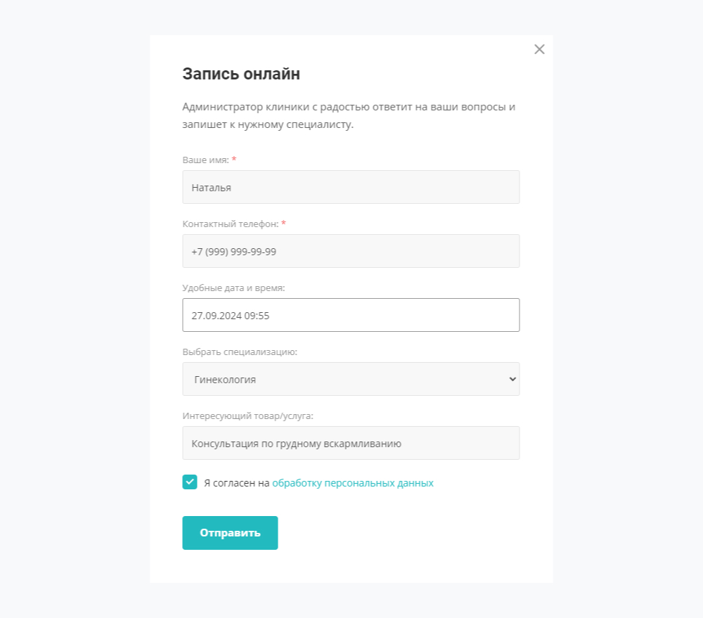 Для записи на прием используйте веб-формы. Клиент укажет имя, телефон, удобную дату и время, специализацию и конкретную услугу. Формы снимут нагрузку с администраторов, которым приходится записывать на прием по телефону и самостоятельно заполнять данные пациентов в систему.
