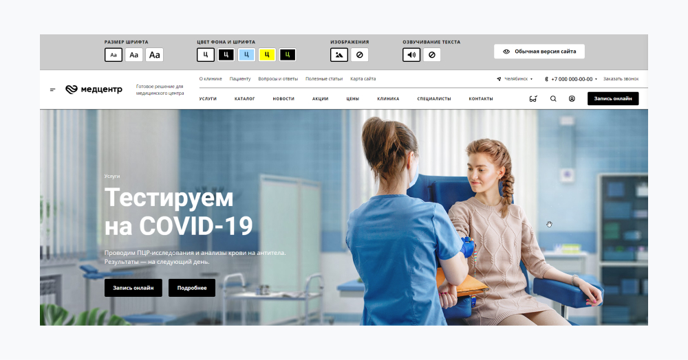 Добавьте версию для слабовидящих. Этот функционал обязан присутствовать по требованию минздрава. Позвольте посетителю выбрать размер, цвет и фон шрифта. Также для легкого восприятия добавьте опцию отключения изображений и озвучивания текста на кнопках.