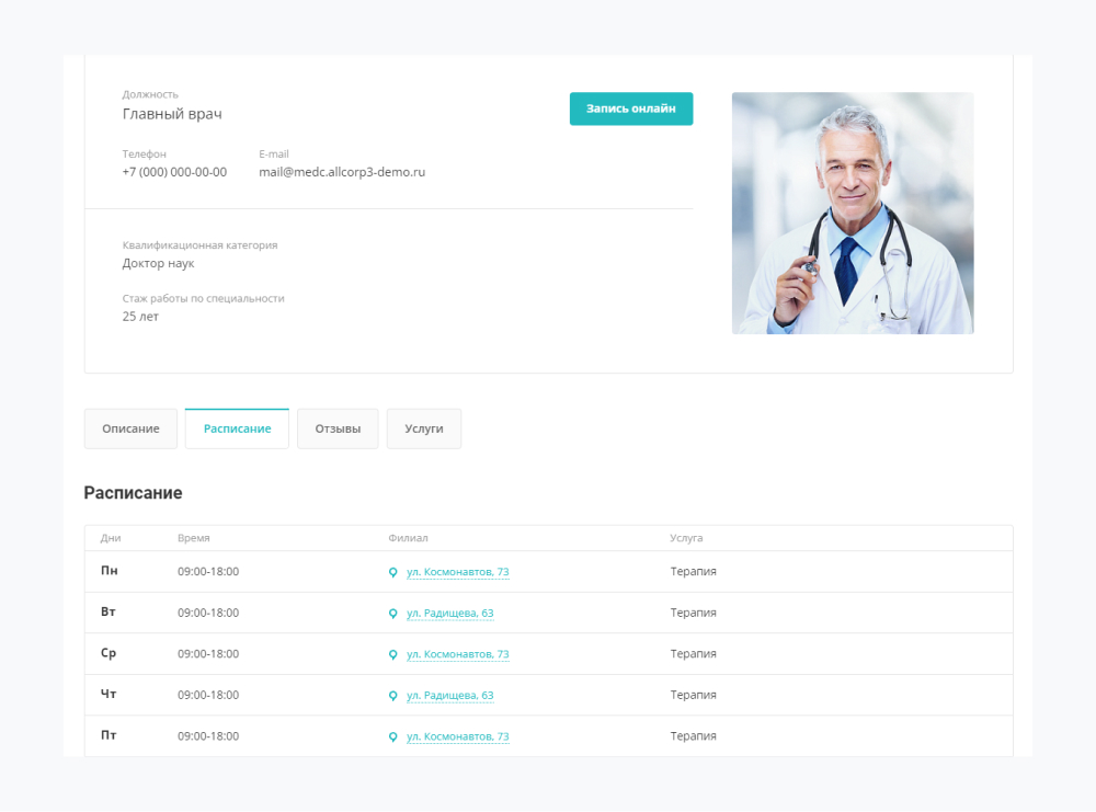 Пациенты доверяют врачу здоровье и жизнь. Добавьте карточки специалистов клиники, чтобы информация о докторе находилась в одном месте. Укажите специализацию, образование, опыт работы и пройденные курсы повышения квалификации. На отдельной вкладке укажите график приема и добавьте карту филиалов, если врач принимает в нескольких местах.