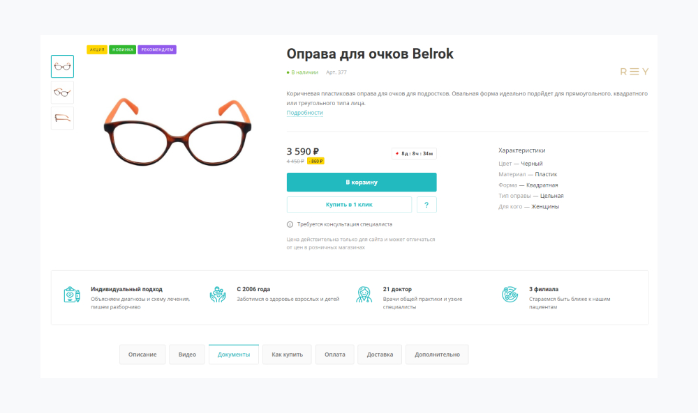 Добавьте товары для увеличения среднего чека. Например, пациенты после приема у окулиста захотят купить оправу для очков или линзы. Чтобы при этом не плодить карточки товаров, используйте торговые предложения. Пользователи смогут изменить в 1 клик базовую кривизну, силу и цвет условных линз в одном месте.