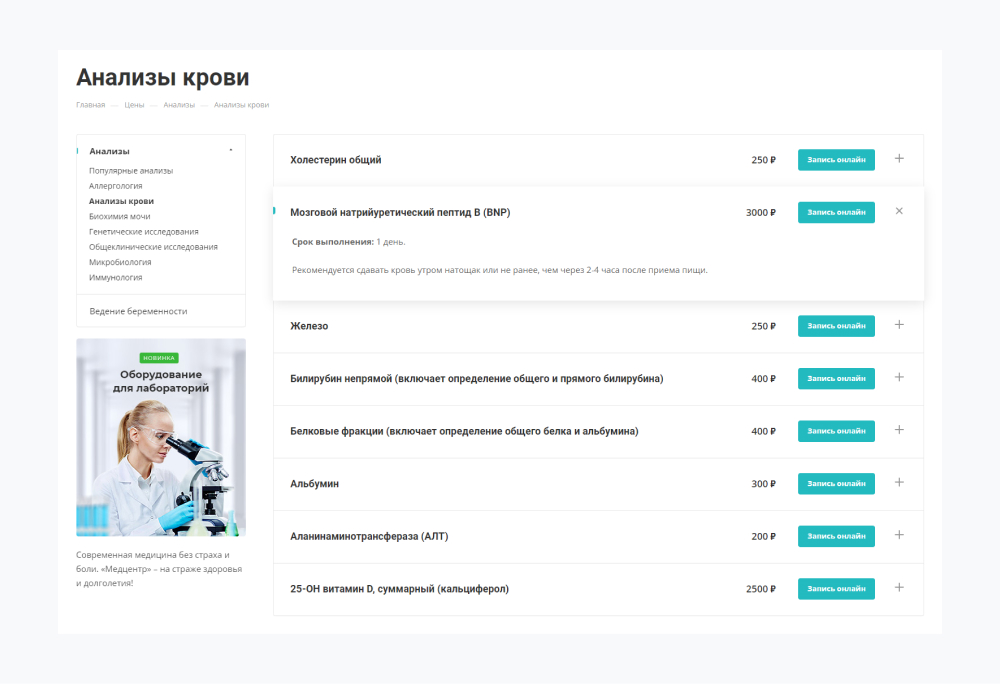Уделите внимание страницам услуг клиники. От качества наполнения будет зависеть, выберет ли клиент медицинское учреждение или нет. Опишите подробно, как подготовиться к приему, за сколько минут приходить в клинику. Не перегибайте с количеством информации. Если текста получилось много, лучше переместите его в блог и прикрепите статью в карточку услуги.