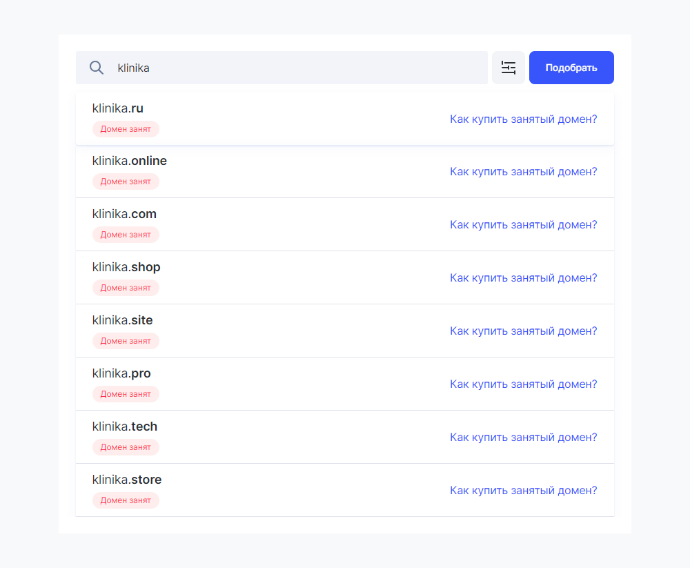 Выберите доменное имя — название медцентра в адресной строке. Подбирать домен рекомендуем сразу в специальном сервисе, который покажет занятые названия и предложит альтернативы. Например, напишем запрос «klinika» — получим неудовлетворительный ответ, что все уже занято. В таком случае, попробуйте выкупить домен или подобрать другой.