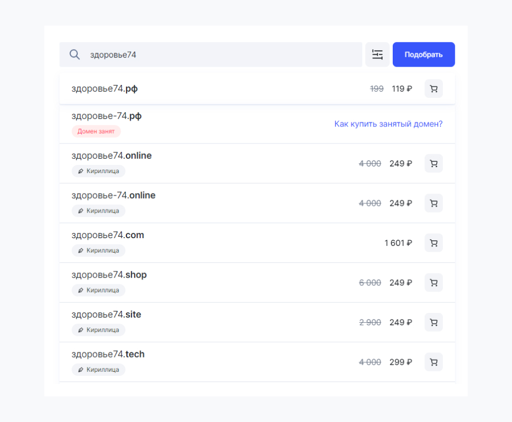 Рекомендуем при выборе домена опираться на название клиники. Так, пользователи легче запомнят URL-адрес интернет-ресурса. Если работаете в одном регионе, добавьте циферное обозначение. Если желаете, измените «.ru» на «.рф» и напишите название на русском. Переберите варианты и получите подборку свободных доменов. Дальше останется купить адрес.