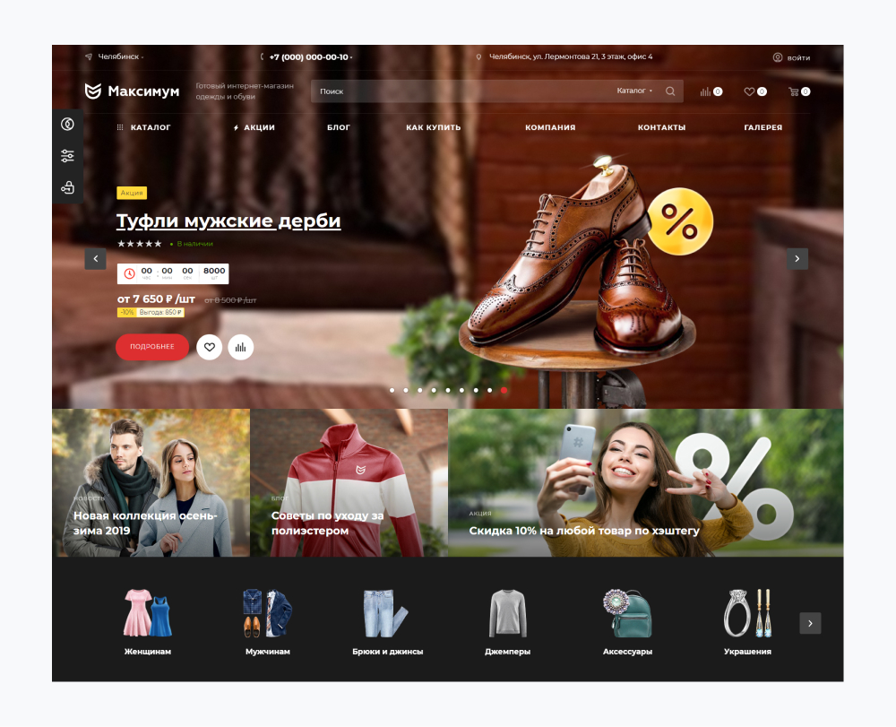 В нашем продукте Аспро: Максимум есть 9 вариантов наполнения, которые идеально подойдут для обувных магазинов. В решении уже есть функционал для повышения продаж: маркетинговые окна, умный SEO и адаптация под мобильные устройства. Посмотрите готовые решения и сравните возможности на сайте.
