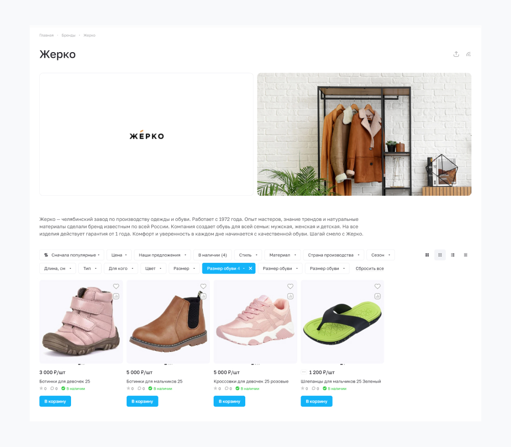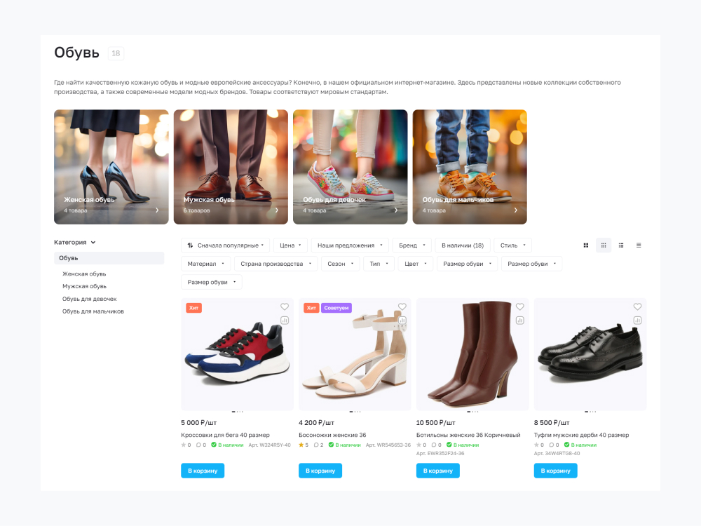 Настройте сортировку продукции по наименованию, цене и популярности. Используйте стикеры, чтобы выделить преимущества обуви, например, «Акция» и «Новинка».