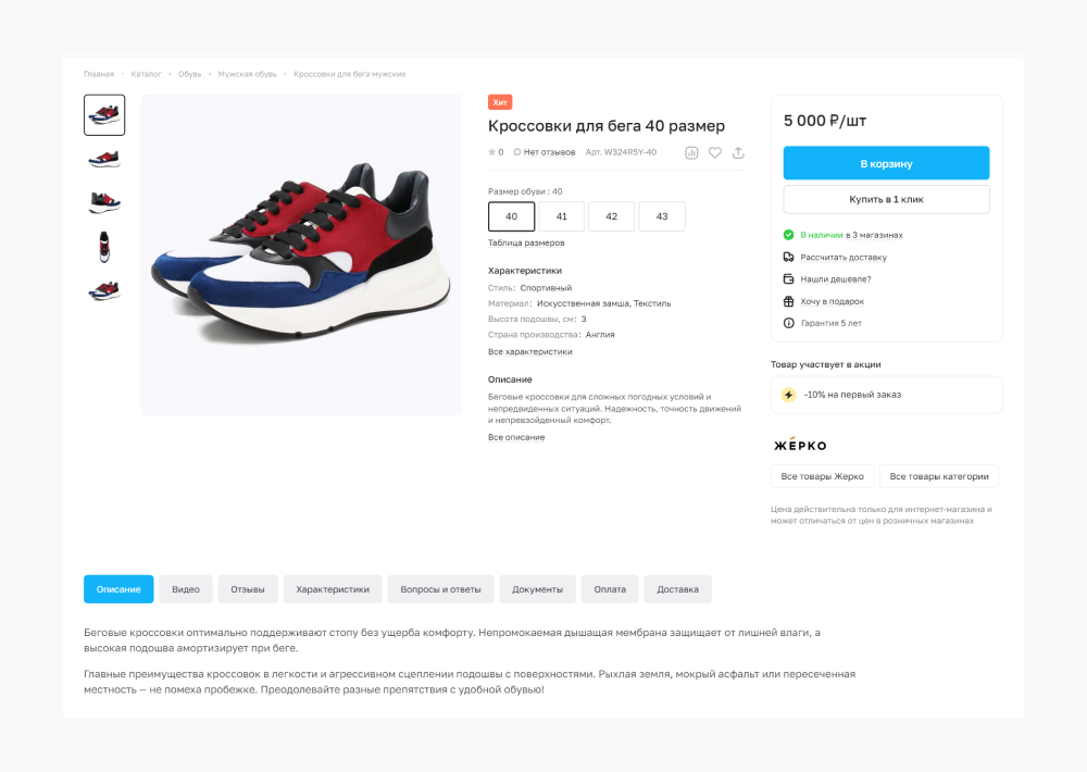 В карточке должна находиться полная информация о продукции: описание, отзывы, фотографии обуви на модели и характеристики. Чтобы люди не ошиблись при выборе обуви, сделайте таблицу с размерами. Расскажите про способы оплаты и доставки — так у покупателей не останется вопросов при оформлении заказа.