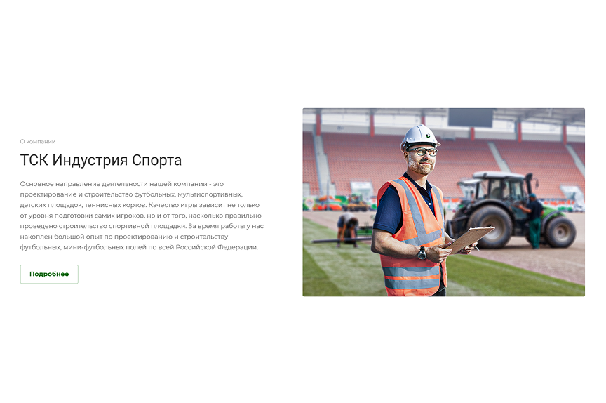 Для блока «О компании» нарисовали инженера, который контролирует строительство спортивного поля. На задний план вынесли бригаду рабочих и трактор.