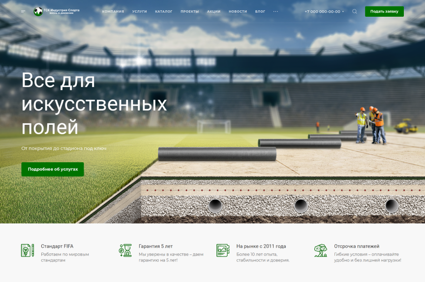 На главном баннере нас попросили изобразить футбольное поле в разрезе: слои грунта и щебня, дренажные трубы и искусственное покрытие. Рабочие на заднем фоне дают понять, что компания не только продает материалы, но и строит площадки.